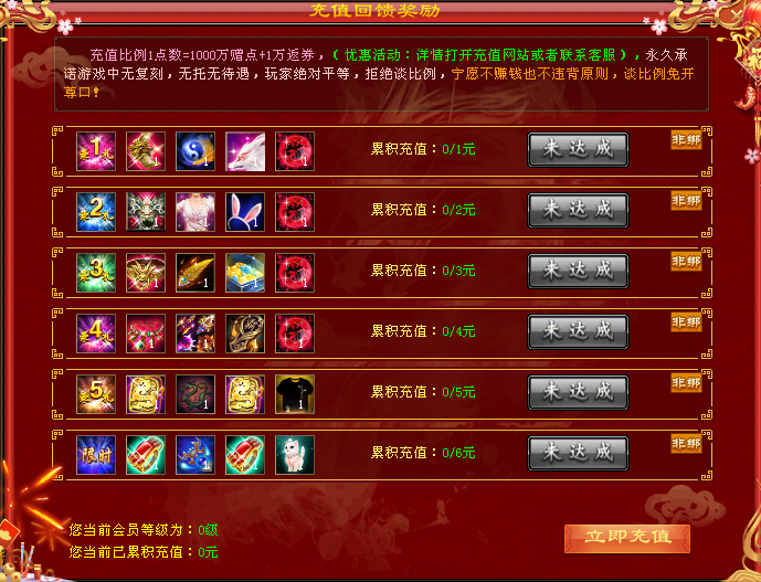 【充值介绍】: 6米满回馈,10元灵器.30元仙器,为了维持服务器开销